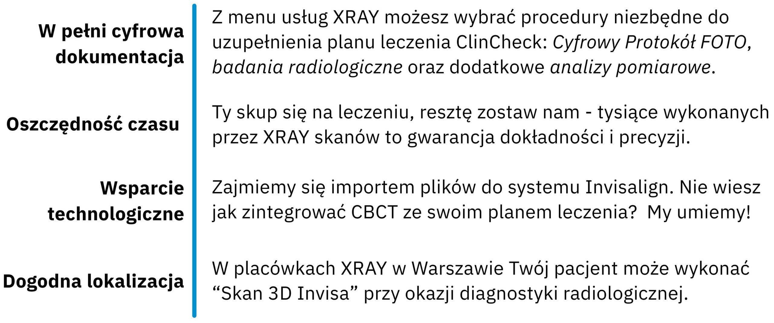 “Skan 3D Invisa” w XRAY to gotowe narzędzie, które przyspieszy rozpoczęcie terapii i odciąży Twój gabinet. Profesjonalne skany 3D w połączeniu z CBCT i innymi usługami towarzyszącymi to wygodny proces i pełne wsparcie dla lekarzy – wszystko po to, by Twoi pacjenci mogli zacząć leczenie bez zbędnych formalności.